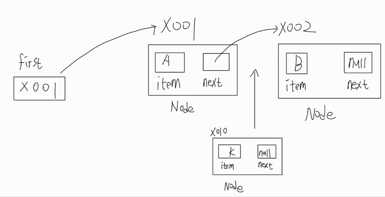 first 의 참조값을 x010으로 바꿨고, x010의 next 값을 x 001로 설정했다. 아주 자연스럽게 맨 첫번째 값에
