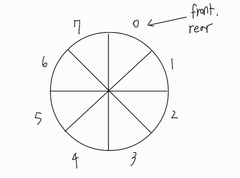 (10 + 1 ) % 8 = 3 , 즉 rear=3의 값이 나오고 front 또한 3의 값이 나온다.