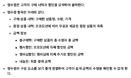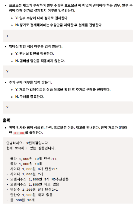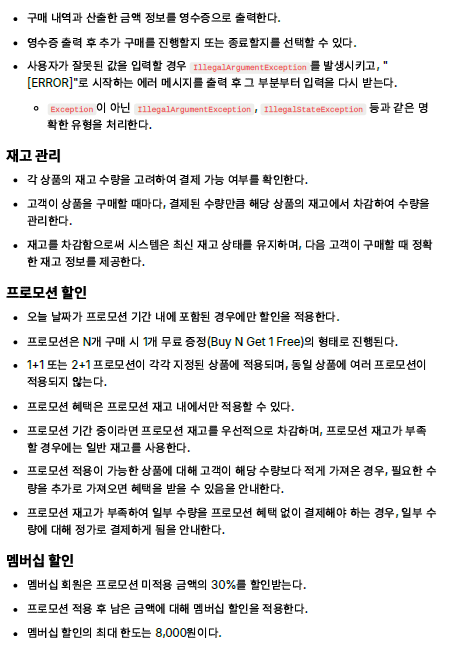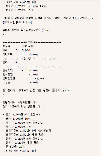 제출 당시 시간이 없어 출력문 포맷팅 또한 맞추지 못 했다. 또한, 멤버십 할인 부분도 내가 원하는 대로 구현하지 못 했다.