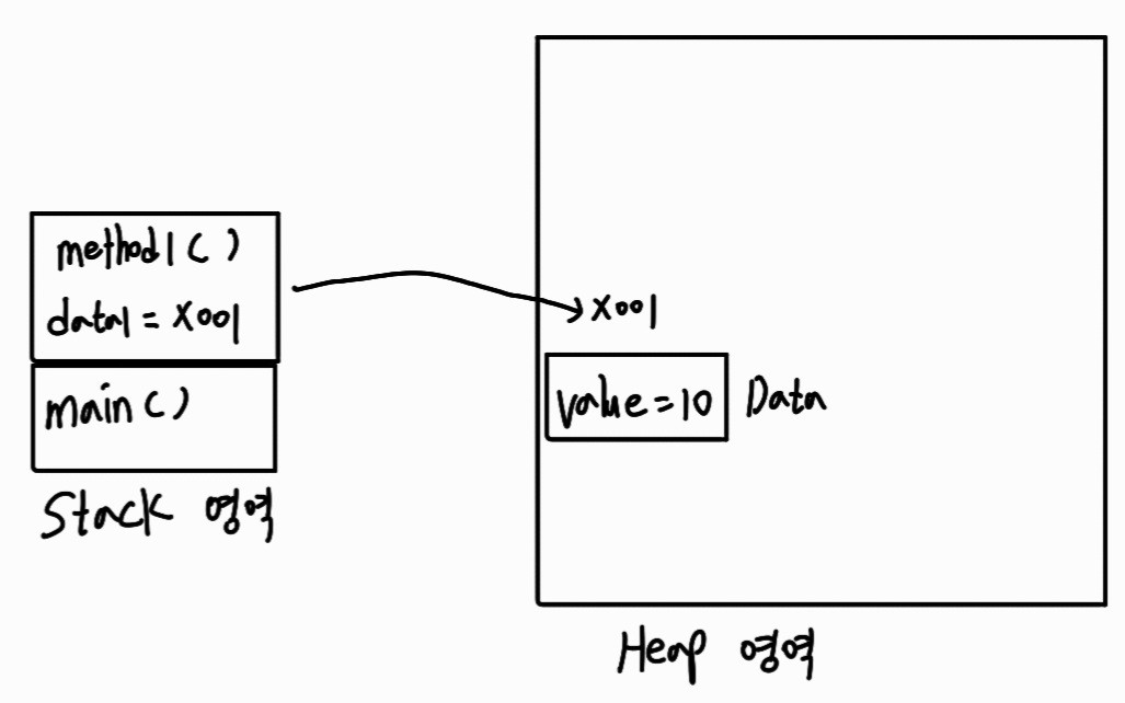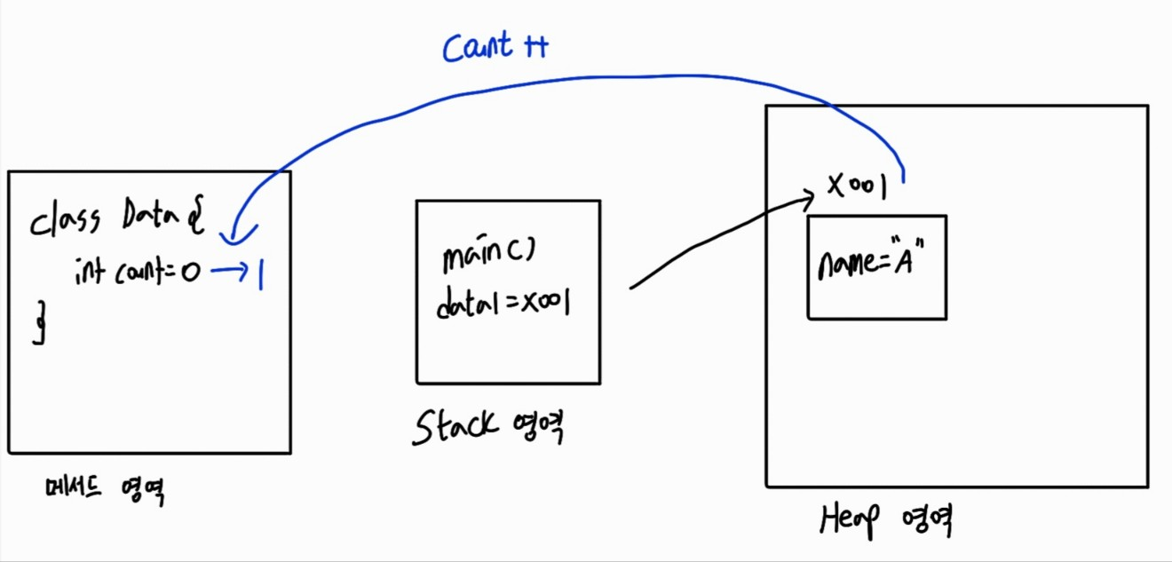 static 변수인 count는 메서드 영역에서 관리되기에 위와 같은 그림이 된다. 만약에 data2 = x002를 하나 더 만들었다고 해도, 메서드 영역에서 관리가 되기에 값을 공유할 수 있는 것이다.
