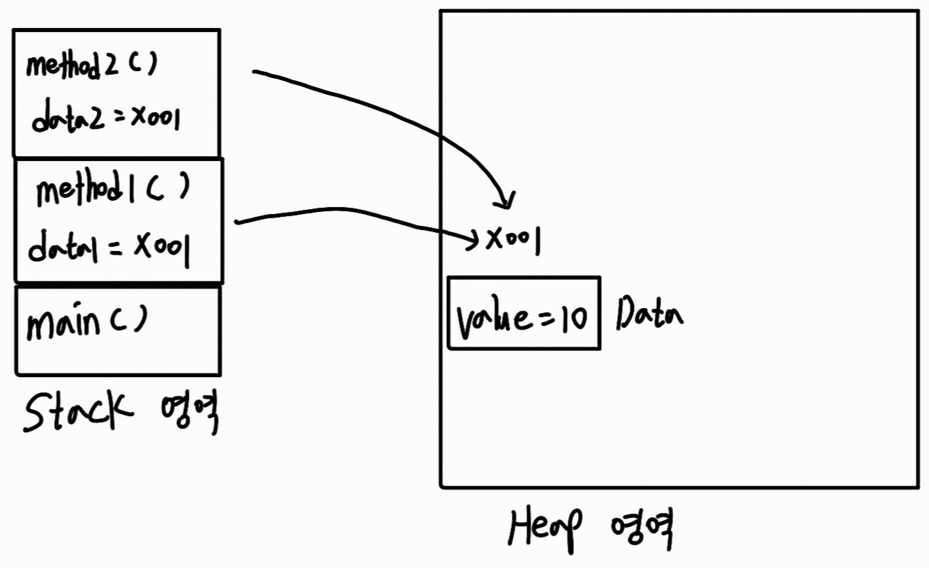 static 변수인 count는 메서드 영역에서 관리되기에 위와 같은 그림이 된다. 만약에 data2 = x002를 하나 더 만들었다고 해도, 메서드 영역에서 관리가 되기에 값을 공유할 수 있는 것이다.