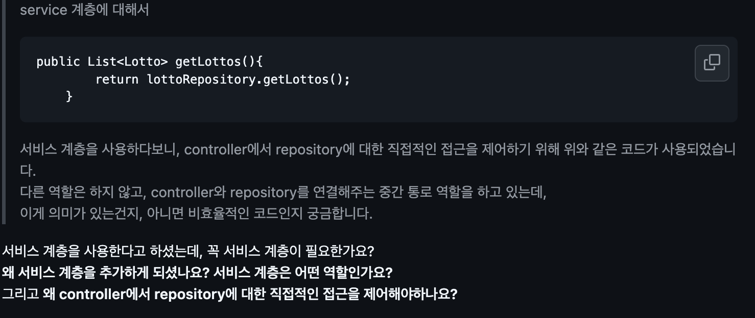미션을 마치고 나면, 우테코 선배님들에게 리뷰를 받을 수 있다. 그 과정에서 내가 모르는 점, 궁금했던 점, 개선사항을 리뷰어에게 물어볼 수 있다. Lotto 미션을 진행하며 service 계층에 대한 의문점이 들었었다.