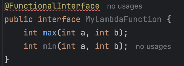MyLamdaFunction Interface에서 2개의 메서드를 지니고 있기에 함수형 인터페이스가 아니다. 그렇기에 위와 같은 상황에서는 익명 클래스를 사용해야 한다.
