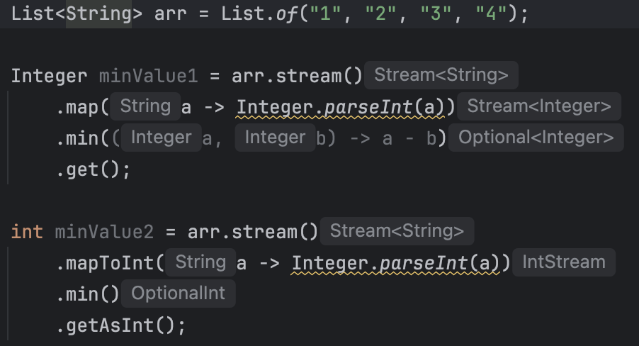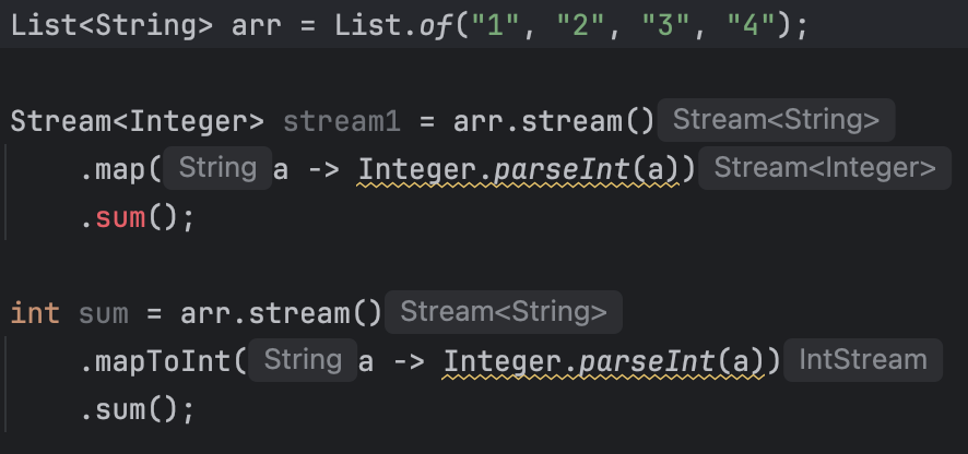 예시를 보면 알다시피, mapToInt를 통해 String -> Int로 변경한 경우에는 IntStream이 제공하는 계산 메서드를 사용해 코드가 훨씬 직관적이다.