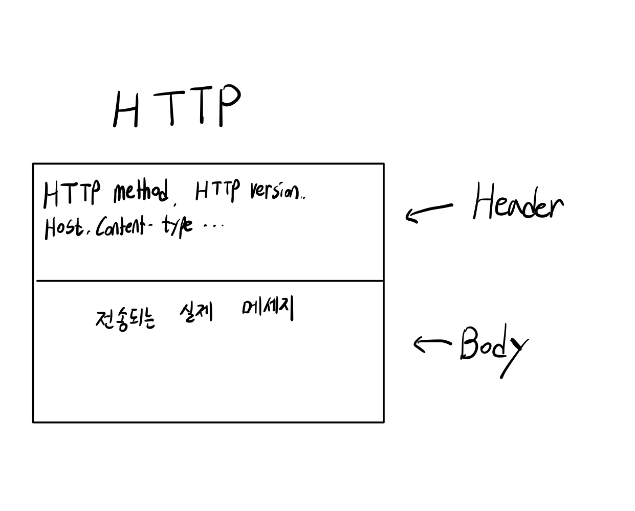 HTTP는 위의 그림과 같이 Header, Body로 나누어져 있다. Header는 메시지를 보내기 위한 정보, Body는 실제 보내지는 메시지를 의미한다. 규칙에 맞게 필요한 정보를 서술하고, 메시지를 담는 형식이다.