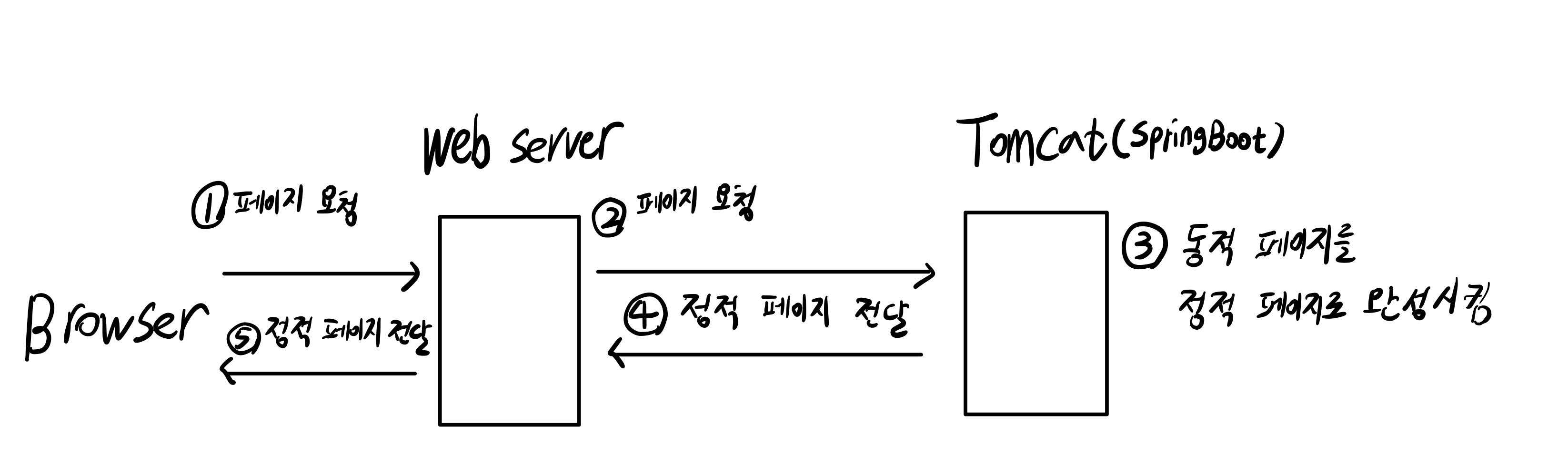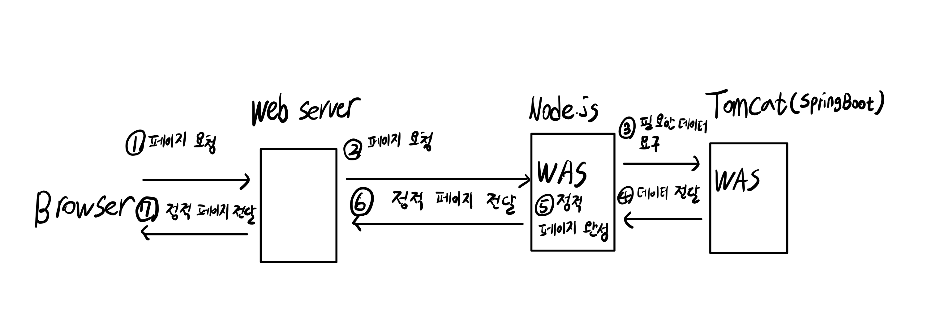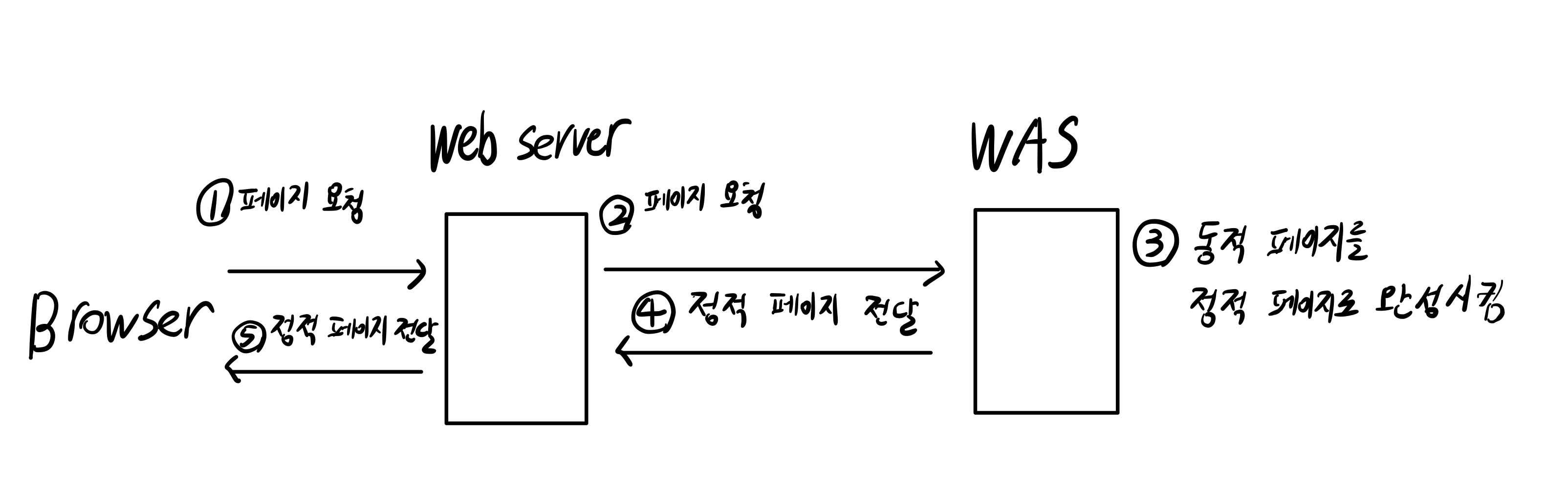 필자가 헷갈렸던 부분은 동적 페이지가 어디서 완성되는지가 매우 헷갈렸었다. WAS에서 동적 페이지를 완성시키는 건지, Web Server에서 동적 페이지를 완성시키는지 헷갈렸다. 서버 사이드 렌더링이라고 하니, Web Server에서 동적 페이지를 완성시킬 수도 있지 않을까?