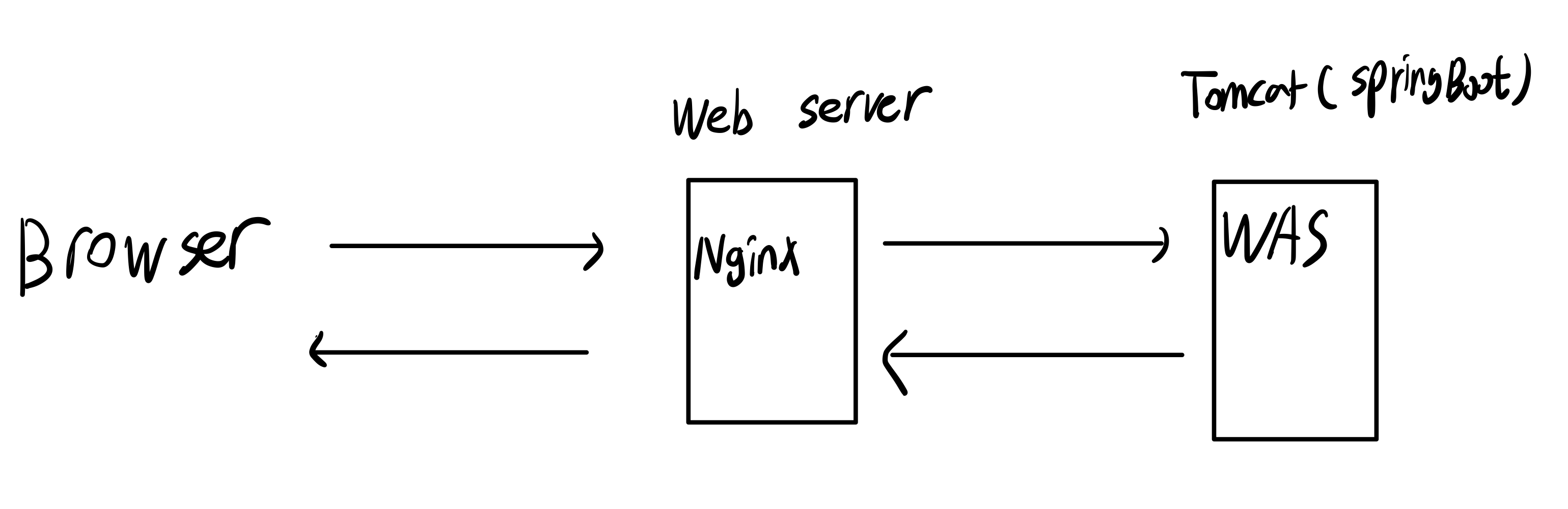 위와 같이 Browser는 Web Server에게 요청을 보내고, Web Server는 WAS에게 요청을 보낸다. 응답도 마찬가지다.