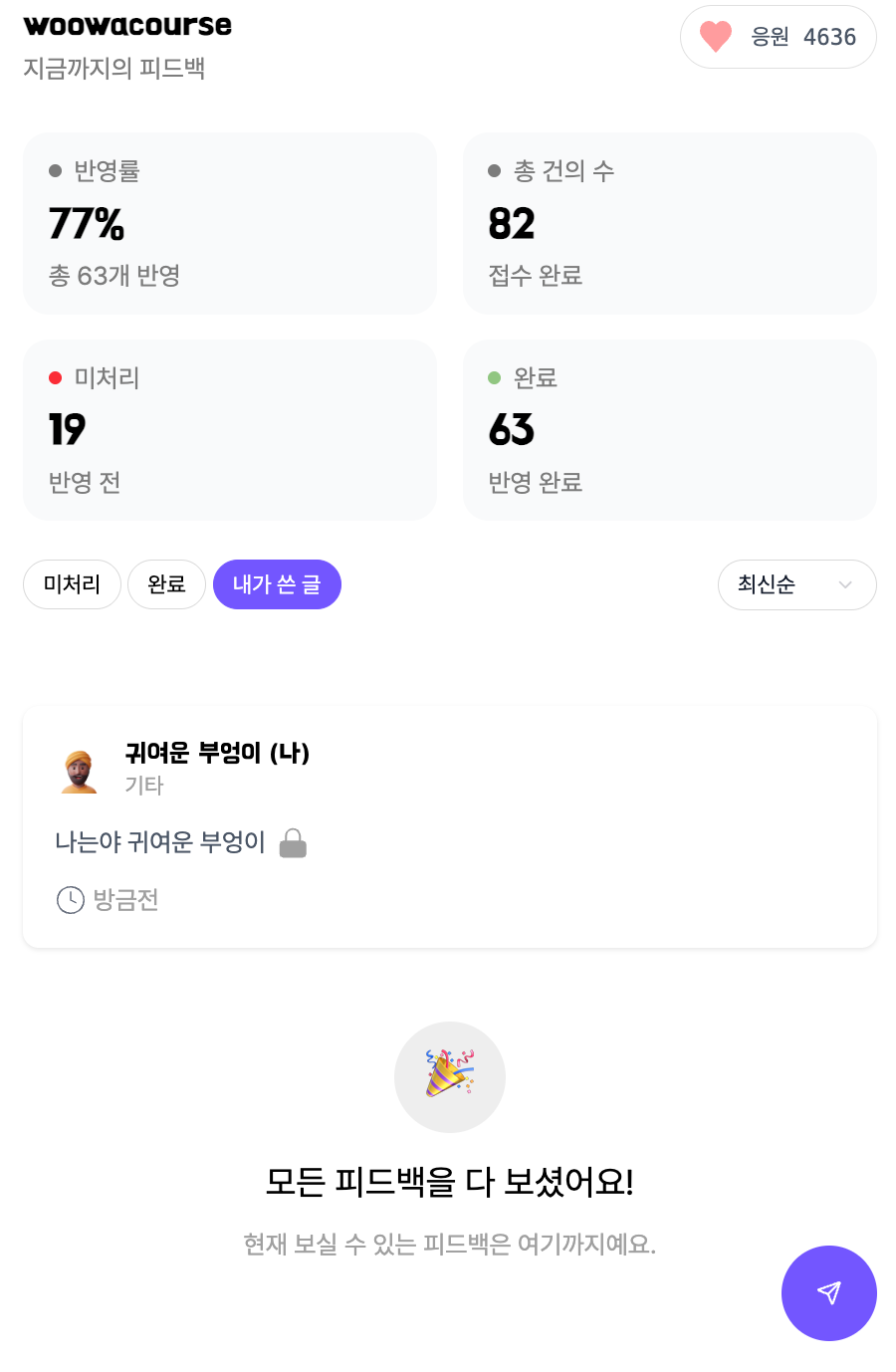 관리자는 답변을 통해 건의 처리 상황에 대해 추가적으로 설명을 할 수 있다. 또한, 작성한 글 추적 및 정렬 기능을 사용자 편의성을 높일 수 있었다.