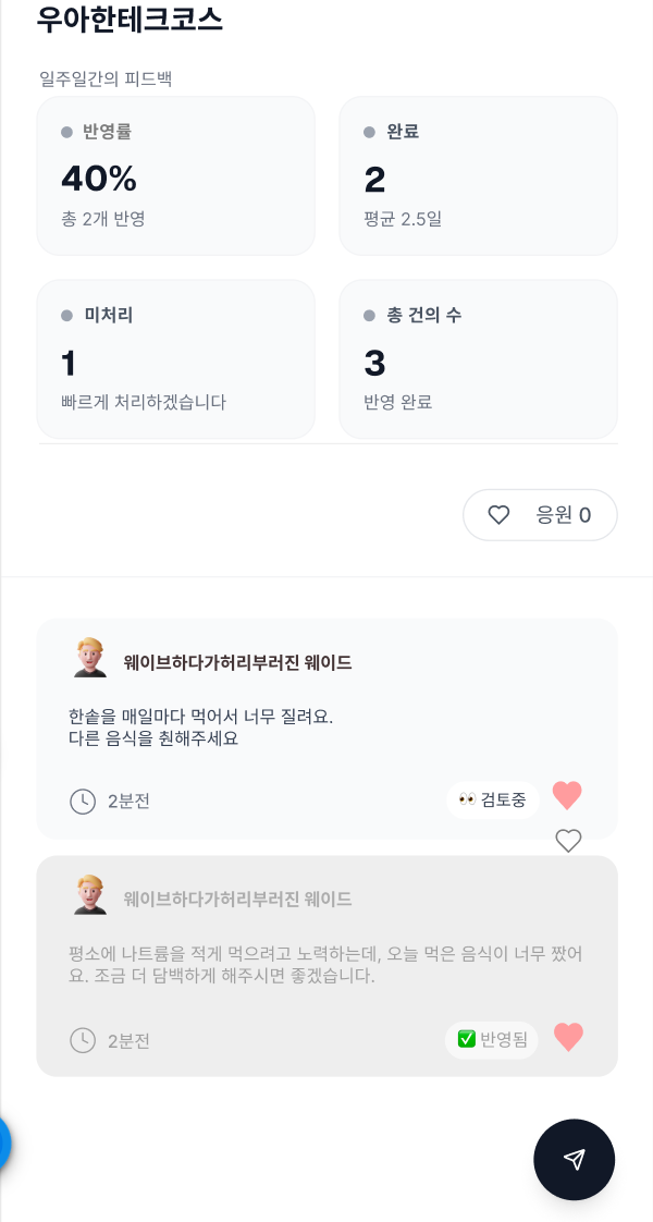 반응은 꽤나 긍정적이었다고 생각한다. 사람들이 캠퍼스 내에서 불편했던 점, 혹은 개선해야 할 사항들을 굳이 시간을 들여 써줄까? 라는 의문이 있었기 때문이다. 정말 우리가 제공하는 핵심 가치가, 고정적인 니즈가 있는걸까? 를 검증하기 위해서 빠르게 배포를 한 것도 있었는데, 반응이 나쁘지 않아 기분이 좋았다.