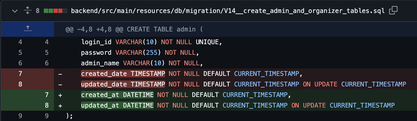 두 번째는 컨벤션 불일치로 인한 오류 사전 방지입니다. 문법상 오류는 아니지만, DB 스키마 불일치로 인해 서버가 종료되었던 경험이 있었어요. 문제를 찾는 데는 오랜 시간이 걸리지 않았지만, 이미 개발 서버가 내려간 이후였죠. 팀원들의 리뷰를 거친 후 머지한 코드였지만, 모든 것을 기억하고 리뷰를 남기기는 힘들었습니다.