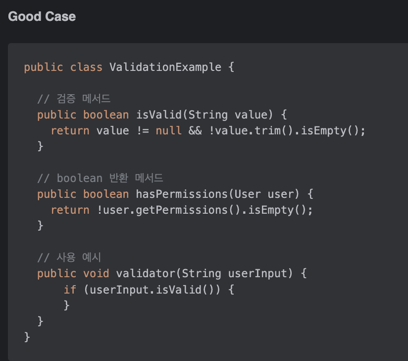 - 검증 혹은 boolean 반환 메서드는 긍정문을 사용한다.