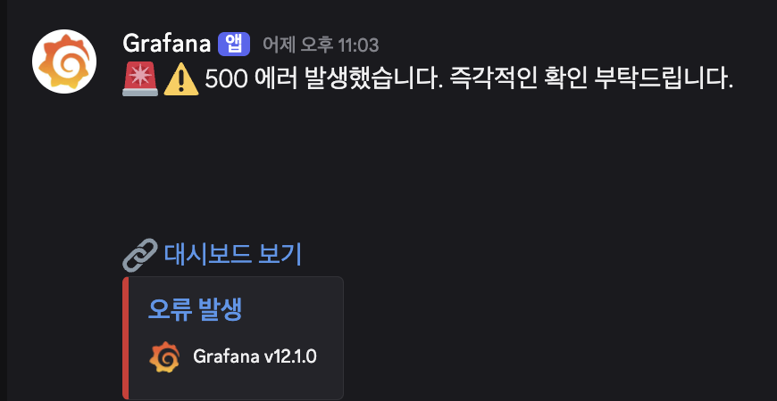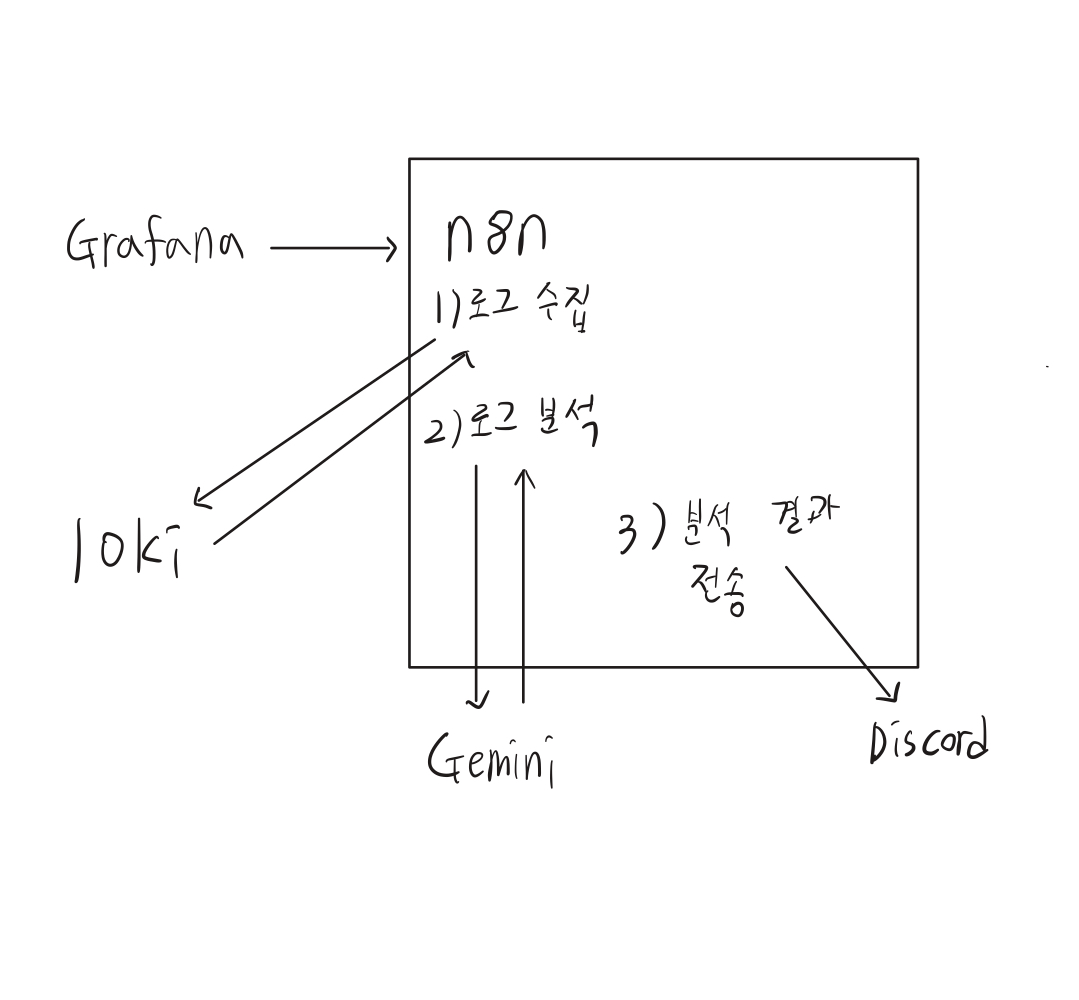 500 에러가 발생했을 경우 Discord 채널로 알람이 발송되는데요, 현재 상황에서는 개발자가 일일이 Grafana Dashboard에 접속해 로그를 분석해야 한다는 불편함이 존재했습니다. 이러한 문제를 해결하기 위해 n8n을 통해 에러 로그 분석을 자동화할 수 있겠다고 생각을 했고, 빠르게 구현을 해봤습니다. 구현의 결과물은 다음과 같습니다.
