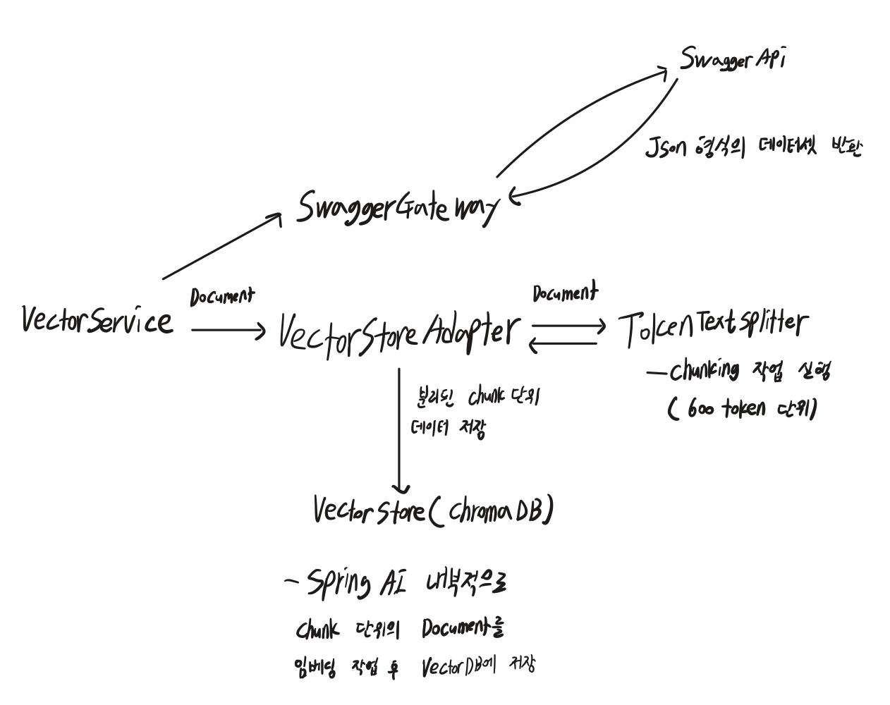 4) vectorStore는 spring AI에서 제공해 주는 인터페이스임. SpringAI 내부적으로 청킹 된 Document를 임베딩 작업 후 연결해 놓은 VectorDB에 저장함