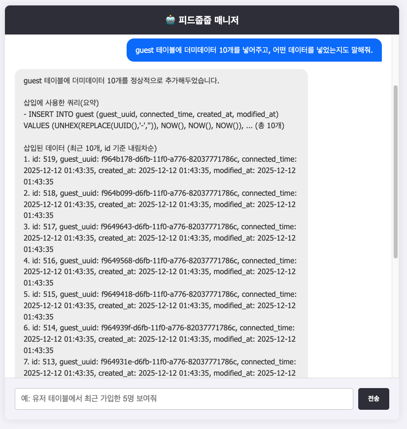 간단히 결과물에 대해 설명을 해보자면, 텍스트 메세지를 전송하면, LLM이 이를 쿼리로 변환해 직접 데이터를 삽입/조회하는 기능이 있습니다.