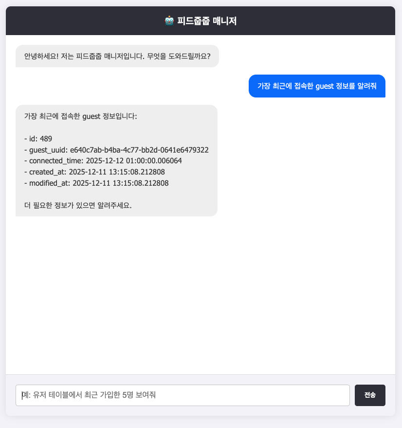 이번에 피드줍줍 매니저라는 AI Agent를 개발했습니다. 간단하게 설명하자면, LLM을 통해 개발 DB에 데이터를 조회/삽입하거나, 팀 개발 문서를 검색해 주는 Agent입니다.