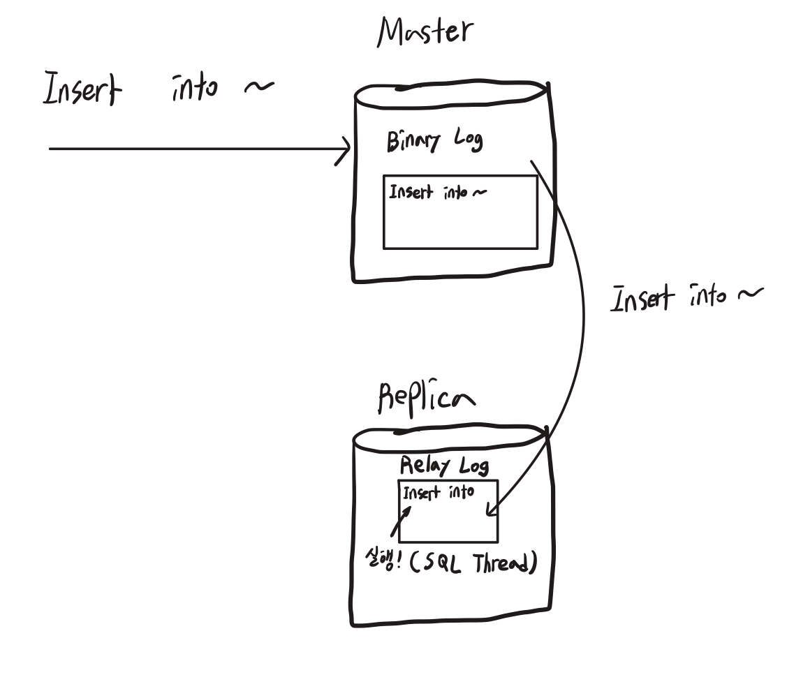 1) Insert, Update 등 쿼리문이 날아오면, 해당 쿼리 실행 후 MasterDB의 Binary Log에 실행 쿼리가 기록됩니다